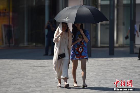 資料圖:北京街頭新人用衣服和傘遮陽。中新網記者 金碩 攝