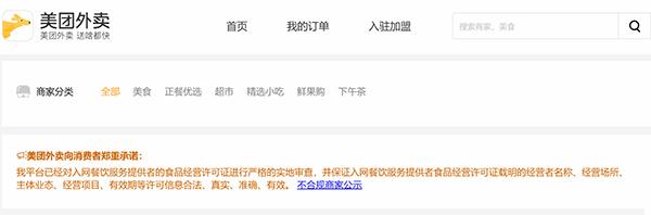 從哪里看違規(guī)餐飲店鋪公示情況?首先,打開三個外賣平臺的網(wǎng)頁版并登陸,選擇“北京地區(qū)”后,可以看到網(wǎng)頁最上端明顯位置發(fā)布了這樣的承諾:“我平臺已經(jīng)對入網(wǎng)餐飲服務(wù)提供者的食品經(jīng)營許可證進行嚴(yán)格的實地審查,并保證入網(wǎng)餐飲服務(wù)提供者食品經(jīng)營許可證載明的經(jīng)營者名稱、經(jīng)營場所、主體業(yè)態(tài)、經(jīng)營項目、有效期等許可信息合法、真實、準(zhǔn)確、有效。”