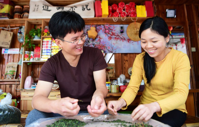 在龍巖市永定區高頭鄉高北村,村民江重生(左二)和愛人張妙丹一起在挑揀茶葉(5月4日 攝)。新華社記者 魏培全 攝