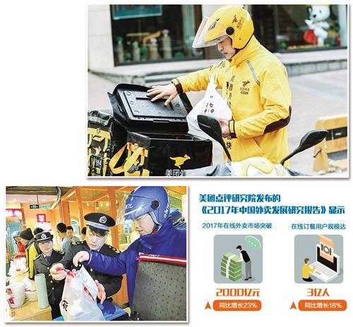 快節(jié)奏的都市生活、迅捷的網(wǎng)絡(luò)支付和日益發(fā)達(dá)的配送網(wǎng)絡(luò),催生了以“美團(tuán)外賣”“百度外賣”“餓了么”等為代表的網(wǎng)絡(luò)餐飲服務(wù)平臺。美團(tuán)點(diǎn)評研究院發(fā)布的《2017年中國外賣發(fā)展研究報(bào)告》顯示,2017年在線外賣市場突破2000億元,同比增長23%;在線訂餐用戶規(guī)模達(dá)3億人,同比增長18%。