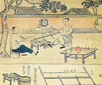 清代李澄淵在光緒十七年(1891年)應(yīng)英國醫(yī)士畢索普要求畫了一組《玉作圖》。《玉作圖》細(xì)致描繪了從搗沙研漿、開玉、解玉、粗磨、細(xì)磨、掏膛、磨琢紋飾等到最后拋光的各個(gè)制作環(huán)節(jié)的場景。