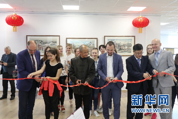 5月18日,“木色華光”的中國木板年畫展開幕式上,中外嘉賓共同為展覽剪彩。新華網發