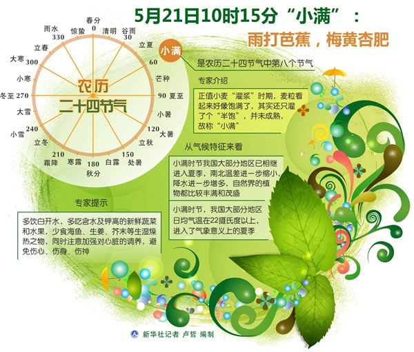 北京時間5月21日10時15分將迎來“小滿”節氣。逢此時節,夜鶯輕啼,雨打芭蕉,梅黃杏肥。從氣候特征來看,小滿時節我國大部分地區已相繼進入夏季,南北溫差進一步縮小,降水進一步增多,自然界的植物都比較豐滿和茂盛。小滿時節,我國大部分地區日均氣溫在22攝氏度以上,進入了氣象意義上的夏季。由于氣溫升高很快,人體難以適應,要特別注意養生調節。>>