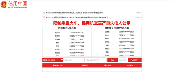 6月1日,中國鐵路客戶服務中心(12306)網站、“信用中國”網站公示了31名經認定有嚴重失信行為將被限制乘坐火車人員名單。同時,5月31日,由民航局政策法規司發布的民航特定嚴重失信旅客名單已出爐,6月1日生效。86名旅客將因自己的失信行為,付出“禁止乘坐民航航班一年”的代價!查看更多>>