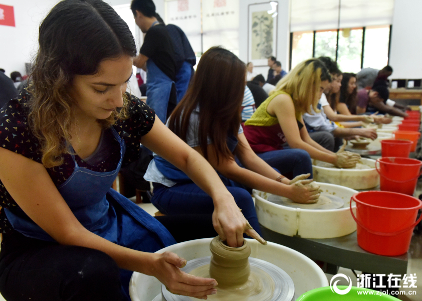 2018年6月3日,來自30多個國家的70多名留學生,在武義漢坊婺窯體驗館開心學習拉坯。