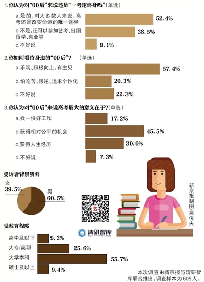 一年一度的高考剛剛落下帷幕。據教育部統計,今年全國共有975萬名考生參加高考,人數創下最近8年來的新高,比去年增加了35萬人。值得注意的是,今年參加高考的學生,大多也是在2000年出生的“千禧寶寶”。雖然說起來,其實所謂的“00后”,跟“80后”、“90后”,以及任何一種“后”,本質上都沒有什么區別。在高考面前,在人生的關口面前,他們都是命運的“考生”。但是,時代不同,一代人也自有一代人不同的際遇。對此,我們需要關注什么?本期“京報調查”(新京報與清研智庫聯合推出)就此展開調查。