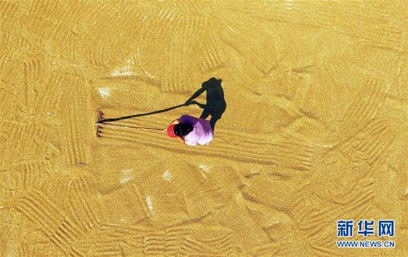 6月19日,河北省遵化市東新莊鎮(zhèn)農(nóng)民在晾曬小麥。新華社發(fā)(劉滿倉 攝)