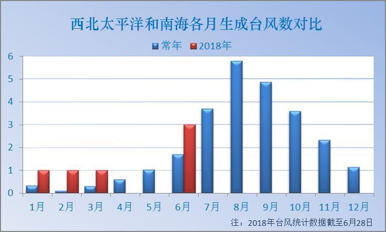 到目前為止,今年西北太平洋和南海已經有6個臺風生成,1個臺風登陸我國,常年1-6月平均會生成4.1個臺風,登陸0.63個。實際上今年無論生成臺風個數還是登陸個數都比常年平均偏多。
