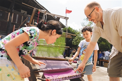 外國游客在湖南通道侗族自治縣體驗侗錦制作。吳三東攝(人民圖片)