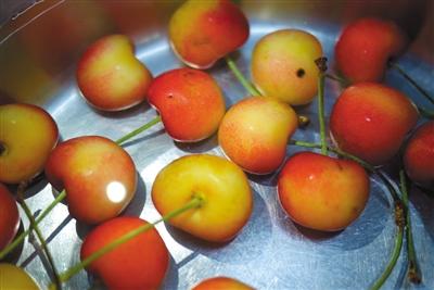 6月26日,鹽水浸泡中的櫻桃,沒有發現小蟲子。新京報記者 王嘉寧 攝