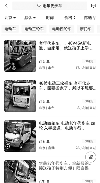 除了新車,北青報記者發現,在二手貨交易平臺上,北京本地的老年代步車等違規電動車也可以正常交易。