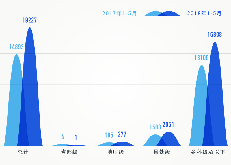 在給予黨政紀處分人數中,除省部級干部人數降低了以外,地廳級、縣處級、鄉科級及以下人數相比同期均大幅提升。特別是,今年1-5月,給予鄉科級及以下人員黨紀政務處分達16898人,相比同期增長28.9%,且占到了處分總人數的87.9%。反映出全面從嚴治黨不斷向基層延伸,持續加大查處群眾身邊的“四風”和腐敗問題力度。