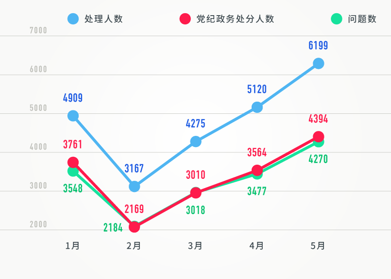 仔細梳理發(fā)現(xiàn),今年1-5月,每月全國查處違反中央八項規(guī)定精神問題數(shù)、處理人數(shù)、給予黨紀政務處分人數(shù)相比去年同期均大幅上升。此外,除2月有下降外,1-5月的各項數(shù)據(jù)呈逐月攀升趨勢。