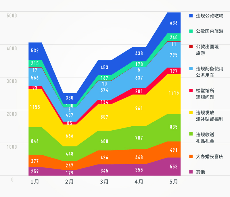 再來看,違反中央八項規(guī)定精神問題類型。從1至5月各類查處問題的面積分布圖來看,各類具體問題的查處趨勢也保持了較穩(wěn)定的增長態(tài)勢。值得注意的是,違規(guī)發(fā)放津補貼或福利、違規(guī)收送禮品禮金、違規(guī)配備使用公務用車、違規(guī)公款吃喝、大辦婚喪喜慶等問題類型,相比同期仍是所有問題類型的“大頭”(占據(jù)前5名),占比仍超80%。數(shù)據(jù)顯示,這些老問題,仍需下大氣力糾治,持之以恒,久久為功。