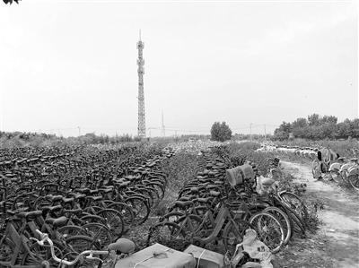 農(nóng)田中堆放數(shù)萬輛二手共享單車