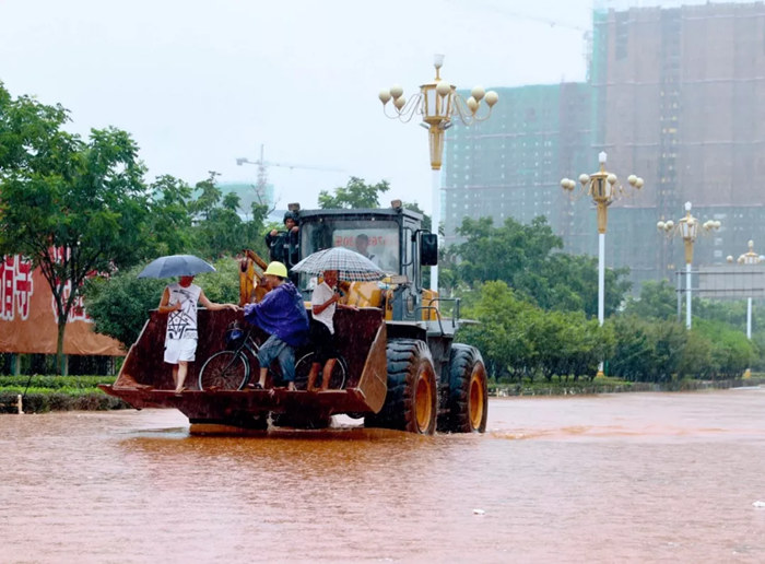 7月6日,江西省撫州市東鄉區部分道路積水嚴重,市民乘坐鏟車通過積水路段 何江華攝