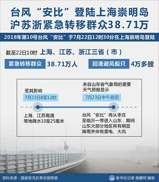 新華社北京7月22日電(記者葉昊鳴、葉婧)記者22日從國家防汛抗旱總指揮部了解到,今年第10號臺風“安比”于當日12時30分在上海崇明島登陸。截至22日10時,上海、江蘇、浙江三省(市)共緊急轉移群眾38.71萬人,有4萬多艘船只回港避風。