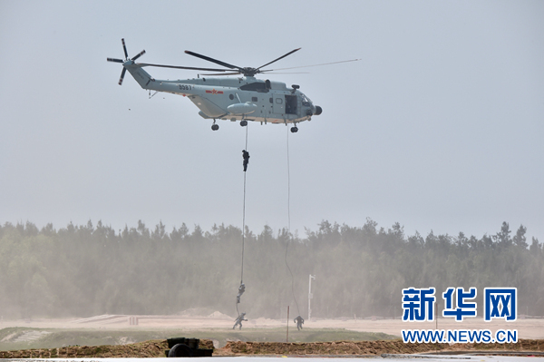 7月29日,在福建泉州賽區(qū)開幕式上,中國海軍陸戰(zhàn)隊在三棲立體登陸作戰(zhàn)課目軍事表演中搭乘艦載直升機滑降。當(dāng)日,“國際軍事比賽-2018”中國承辦賽事開幕式分別在新疆庫爾勒市和福建泉州市舉行。 新華社記者 姜克紅 攝