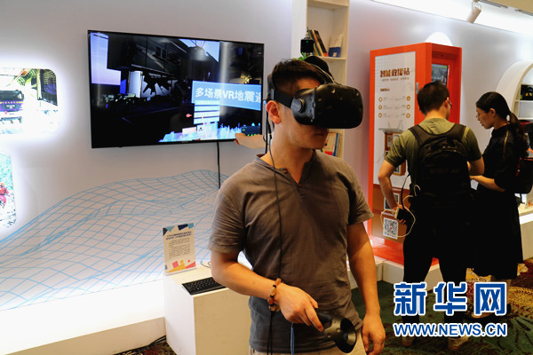 圖為參展人員體驗VR地震模擬器。新華網(wǎng)汪亞/攝