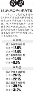 《義務教育質量監(jiān)測報告》指出,學生視力不良問題突出,四年級、八年級學生視力不良檢出率分別為36.5%和65.3%。實際上,不僅僅只有報告中義務教育的學生存在視力問題,我國青少年視力的整體情況也十分不樂觀。根據(jù)世界衛(wèi)生組織的最新研究報告,目前中國近視患者人數(shù)多達6億。其中我國初高中生和大學生的近視率均已超過七成。我國青少年近視率已高居世界第一。相比之下,美國青少年的近視率約為25%,澳大利亞僅為1.3%,德國的近視率一直控制在15%以下。