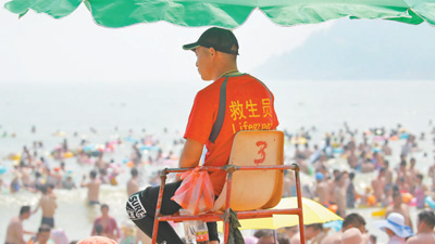 8月5日,一名救生員在江蘇省連云港市連島海水浴場(chǎng)移動(dòng)瞭望塔上值守。王健民攝(人民視覺(jué))