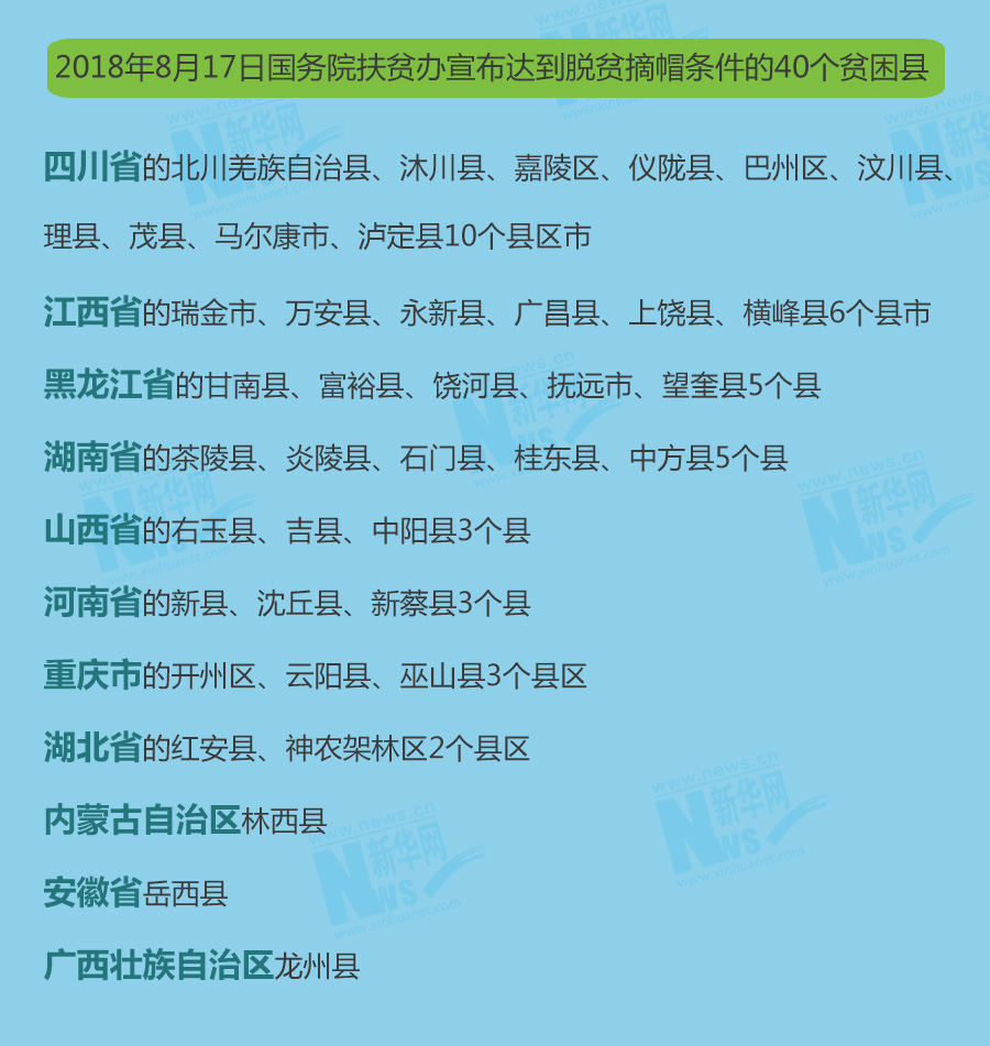 國務院扶貧辦副主任夏更生表示,此次實現脫貧的40個縣是:四川省的北川羌族自治縣、沐川縣、嘉陵區、儀隴縣、巴州區、汶川縣、理縣、茂縣、馬爾康市、瀘定縣10個縣區市,江西省的瑞金市、萬安縣、永新縣、廣昌縣、上饒縣、橫峰縣6個縣市,黑龍江省的甘南縣、富裕縣、饒河縣、撫遠市、望奎縣5個縣,湖南省的茶陵縣、炎陵縣、石門縣、桂東縣、中方縣5個縣,山西省的右玉縣、吉縣、中陽縣3個縣,河南省的新縣、沈丘縣、新蔡縣3個縣,重慶市的開州區、云陽縣、巫山縣3個縣區,湖北省的紅安縣、神農架林區2個縣區,內蒙古自治區林西縣,安徽省岳西縣,廣西壯族自治區龍州縣。