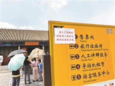 14日下午,北青報(bào)記者來到了恭王府博物館。正值暑期,景區(qū)大門外的廣場(chǎng)上聚集了眾多游客,其中有些是旅行團(tuán)整團(tuán)參觀,還有一些是散客。