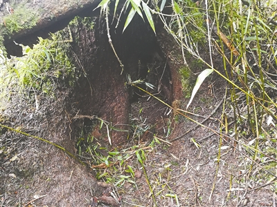 在熊貓幼崽玩耍的樹下,隊員們發現了一個樹洞。根據大熊貓的生活習性,隊員們初步判定這可能是熊貓產仔時用的樹洞,被發現的這只幼崽有可能就是在此處被產下的。在樹干上有一些動物留下的抓痕,本被綠色植被包圍的樹干上有幾塊變得光禿禿的,隊員用手測量了大概的尺寸,根據抓痕的范圍及新鮮程度,判斷很可能是大熊貓爬樹的痕跡。