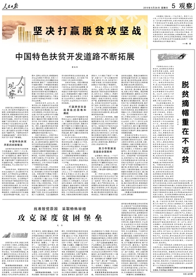 全面建成小康社會,一個也不能少。黨的十八大以來,以習近平同志為核心的黨中央圍繞脫貧攻堅作出一系列重大部署和安排,全面打響脫貧攻堅戰,拓展了中國特色扶貧開發道路,脫貧攻堅取得決定性進展。黨的十九大明確把精準脫貧作為決勝全面建成小康社會必須打好的三大攻堅戰之一,作出了新的部署。《中共中央國務院關于打贏脫貧攻堅戰三年行動的指導意見》為推動脫貧攻堅工作更加有效開展進一步完善頂層設計、強化政策措施、加強統籌協調。在未來兩年多時間里,如何攻克深度貧困堡壘,實現穩定脫貧不返貧,讓中國特色扶貧開發道路越走越寬廣?本期觀察版圍繞這些問題進行探討。