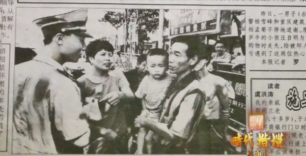 有兩個陌生男子,聲稱是他的爸爸,試圖領走他。幸虧遇到了剛參加工作不久的21歲民警楊雪峰。楊雪峰抱著他找遍了整個百貨公司,終于找到了滿頭大汗焦急萬分的爸爸。