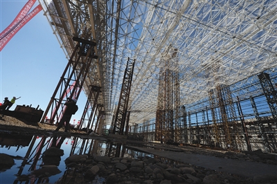 昨日,工作人員在為鋼結構屋頂最后的一次提升做準備。上午10時37分,北京新機場南航基地1號機庫7200噸的鋼結構屋架成功提升就位,標志著這座亞洲最大機庫封頂。新京報記者 吳江 攝