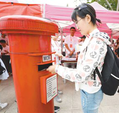 山東師范大學文學院新生將寫給自己的卡片寄到郵筒里,四年后,在他們畢業時將收到這張卡片留作紀念。人民視覺