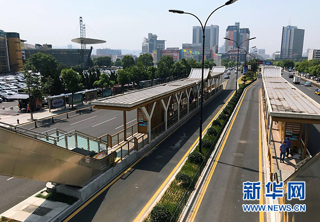 公交專用道設立在馬路中央,減少了道路兩側路口以及其他社會車輛對公交運營的影響。新華網 郝多 攝
