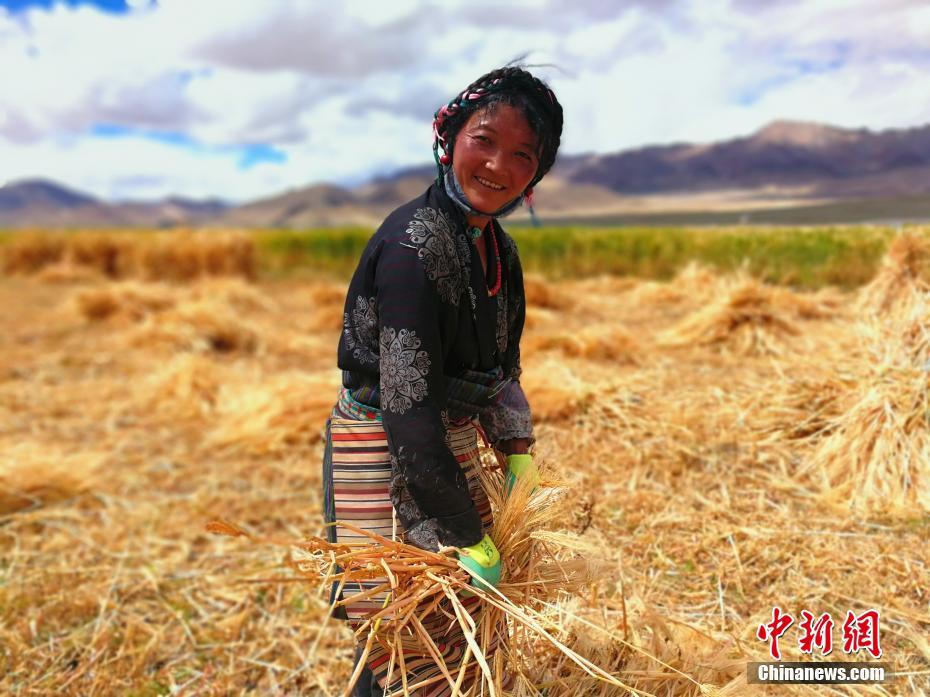 圖為9月12日日喀則市定日縣扎果鄉的農牧民次仁曲珍在地里收青稞。 中新社記者 趙延 攝