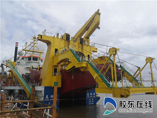 在啟東海工船舶工業園,隨著機械的轟鳴聲,呈現在采訪團眼前的是船臺密布、塔吊林立、一派繁忙的景象。尤為引人矚目的,是大國重器“天鯤號”,巨大的船體以藍色為主,與碧海藍天共同構成了一幅氣勢磅礴的畫卷。