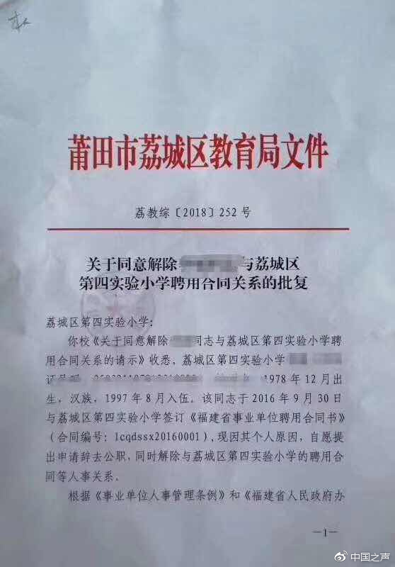網上還流傳著一份落款為荔城區教育局9月19日的紅頭文件,該文件是發給荔城區第四實驗小學的,主要內容是因老師個人原因,自愿提出申請辭去公職,教育局批復同意解除這名教師和學校的人事關系。有家長因此將此文件和微信截圖聯系在一起,在朋友圈表示,微信截圖中的“廖老師”已經被解職。
