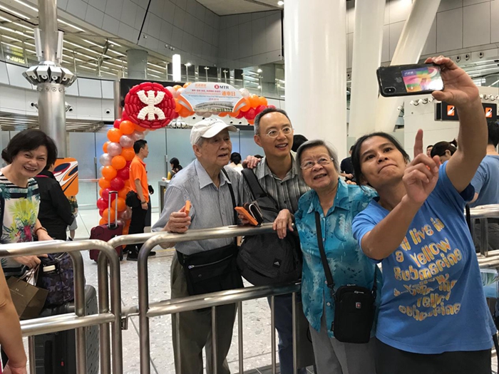香港西九龍站, 80多歲家住深圳的黃奶奶送老伴和兒子去香港會見老朋友,“他們很多小時候的同學(xué)在香港,多年沒見了,今天通了高鐵,十幾分鐘就過來了。”
