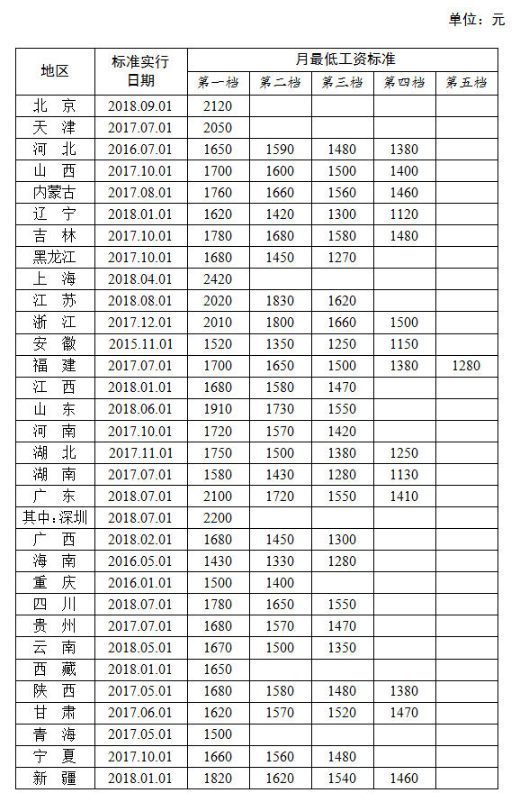 全國(guó)各地區(qū)月最低工資標(biāo)準(zhǔn)情況(截至2018年9月),來(lái)源人社部官網(wǎng)