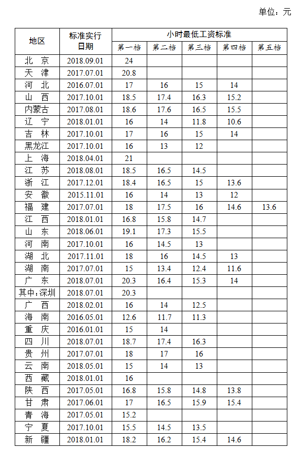 全國(guó)各地區(qū)小時(shí)最低工資標(biāo)準(zhǔn)情況(截至2018年9月),來(lái)源人社部官網(wǎng)