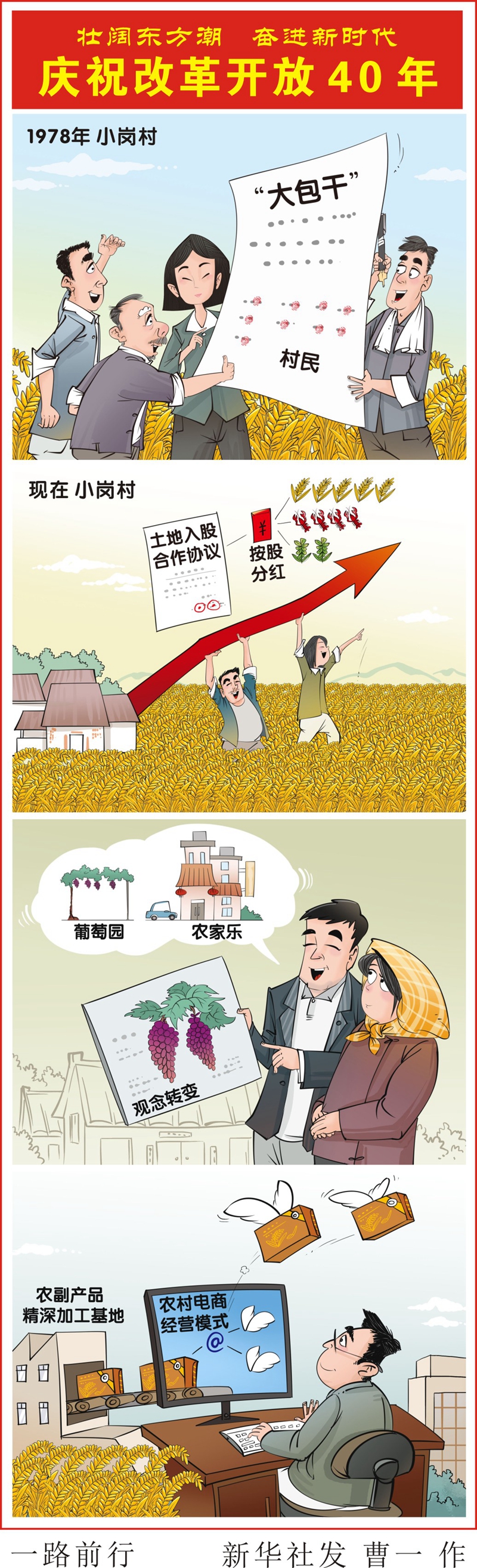 1978年的小崗村,18位村民按下了分田到戶的紅手印,“大包干”拉開了中國農村改革的大幕。40年后的小崗村,正在開展農村集體產權制度改革,土地入股讓農民變股東;葡萄園里開起了農家樂,對農副產品進行精深加工,電商經營模式助力產品打開銷路,觀念的轉變讓小崗村里的農民不再僅僅種著一畝三分地。