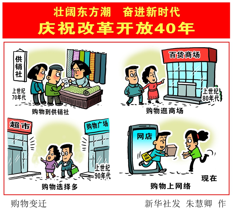 消費:上世紀70年代,購物到供銷社;上世紀80年代,購物逛商場;上世紀90年代,購物選擇多;如今,購物上網絡。↓↓
