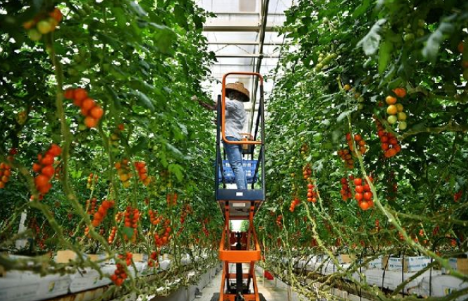 在海南省陵水現代農業示范基地,工人在管理通過擱架吊蔓式栽培技術種植的詹妮瑞番茄。新華社記者 郭程 攝