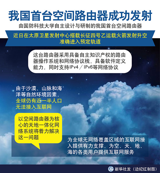 新華社長沙10月29日電(趙寶康、劉于藍)由國防科技大學自主設計與研制的我國首臺空間路由器,近日在太原衛星發射中心搭載長征四號乙運載火箭發射升空,準確進入預定軌道。