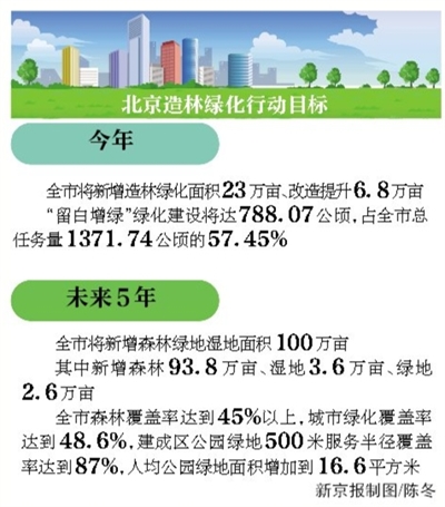 市園林綠化局副局長蔡寶軍告訴記者,新一輪百萬畝造林綠化總體規劃,將在城市核心區實現生態景觀重塑,中心城區和新城區多元增綠,形成城市森林與公園綠地為主體的城市綠化體系。未來,北京市將以城市副中心、北京新機場、冬奧會、永定河、大運河、“三山五園”、十八里店、南中軸等重點區域綠化為節點,形成大尺度森林濕地群落、高品質綠地公園組團、多景觀田園村莊綠化為主體的綠化體系。