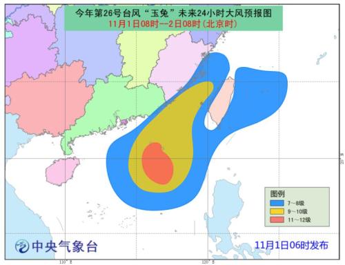 受“玉兔”和冷空氣共同影響,11月 1日08時到11月2日08時,廣東東部、福建中南部沿海、臺灣東部和南部等地將有大雨,局地有暴雨或大暴雨(50~110毫米)。東海南部偏南海域、臺灣以東洋面、巴士海峽、南海中東部偏北海域和南海西北部偏東海域及臺灣沿海將有7~8級大風(fēng),陣風(fēng)9~10級;臺灣海峽、福建沿海、廣東東部沿海、南海東北部大部海域風(fēng)力達(dá)9~10級,陣風(fēng)11~12級;“玉兔”中心經(jīng)過的南海東北部的部分海域或地區(qū)的風(fēng)力可達(dá)11~12級,陣風(fēng)13~14級(見圖2)。