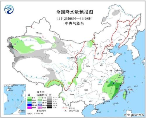 圖3 全國降水量預(yù)報圖(11月1日08時-2日08時)。圖片來源:中央氣象臺網(wǎng)站