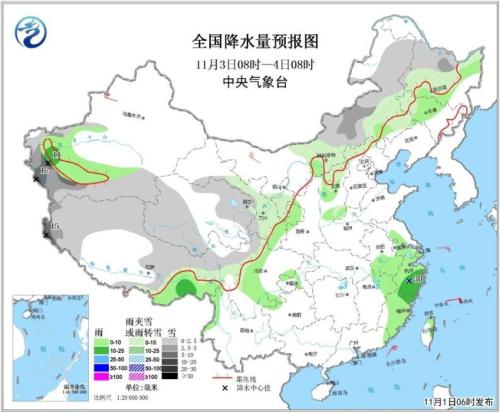 11月1日08時至2日08時,新疆北部和南疆西部山區(qū)等地部分地區(qū)有中到大雪或雨夾雪,局地有暴雪(10~15毫米)。江南東部、廣東中東部和臺灣島東北部等地的部分地區(qū)有中到大雨,其中,廣東東部、福建南部和臺灣等地局地有暴雨或大暴雨(100~110毫米)。新疆北部、南疆盆地、內(nèi)蒙古西部和甘肅西部等地的部分地區(qū)有5~6級及以上風(fēng)。臺灣海峽、南海東北部海域?qū)⒂?~9級大風(fēng),陣風(fēng)10~11級(見圖3)。