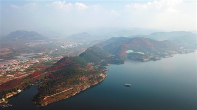 今年10月17日,航拍平谷區金海湖漫山遍野的紅葉。平谷是全市生態涵養區7個區之一。