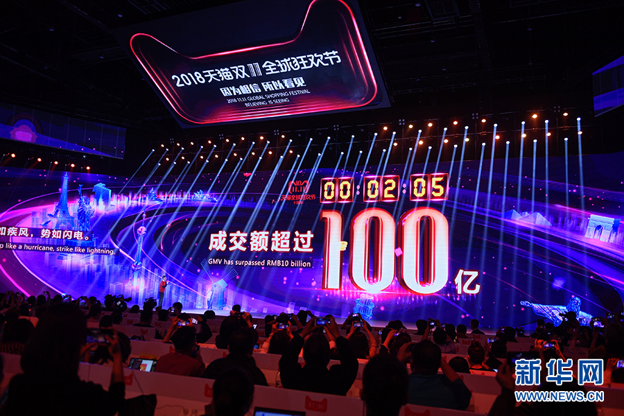 11月11日,在上海舉行的“2018天貓雙11全球狂歡夜”晚會(huì)上,阿里巴巴平臺(tái)的大屏顯示僅用了2分05秒阿里巴巴平臺(tái)上的成交額沖破100億元人民幣。新華社記者 黃宗治 攝?
