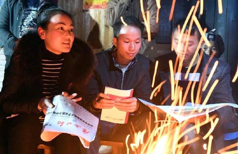 基層干部徐秋華(左)帶領廣西融水苗族自治縣四榮鄉榮地村村民學習“鄉村振興戰略”精神 張愛林 攝
